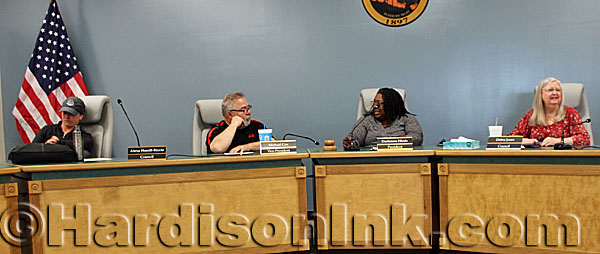 The four members of Williston City Council at the special meeting late Friday afternoon (April 10) are (from left) Williston City Councilwoman Alexa Haniff-Riccio, Vice President Michael Cox, President Darfeness Hinds, and Councilwoman Debra Jones. Also present, but not pictured, is Williston Mayor Charles Goodman. Councilwoman Meredith Martin was absent.