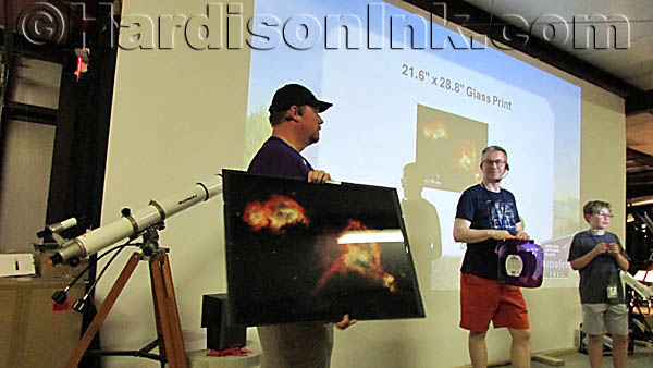 Matthew Peters brings a large celestial photograph he took and that was then etched into glass by a company in Gainesville that was among the donors up to the front, where it was won by a raffle participant.